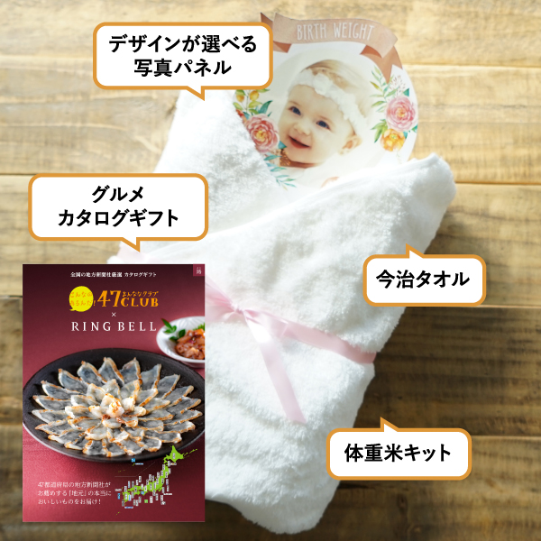 | 内容物 | カタログギフト 47CLUB【5000円コース】路(みち)×1、PREMIUM バスタオル1枚(ホワイト)×1、リボン、米袋、お写真入りパネル |