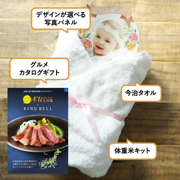 | 内容物 | カタログギフト 47CLUB【10000円コース】郷(さと)×1、PREMIUM バスタオル1枚(ホワイト)×1、リボン、米袋、お写真入りパネル |