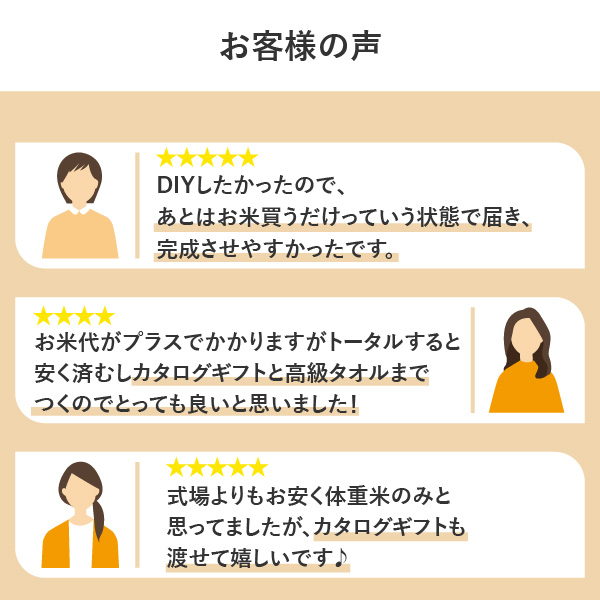 お母さんには生まれた時の体重を再現した体重米とお写真入りパネル、お父さんにはこだわりの逸品をお届けするカタログギフト… 結婚披露宴のワンシーンに、PIARYの体重米手作りキットでご両親へ最高の感謝を伝えませんか?