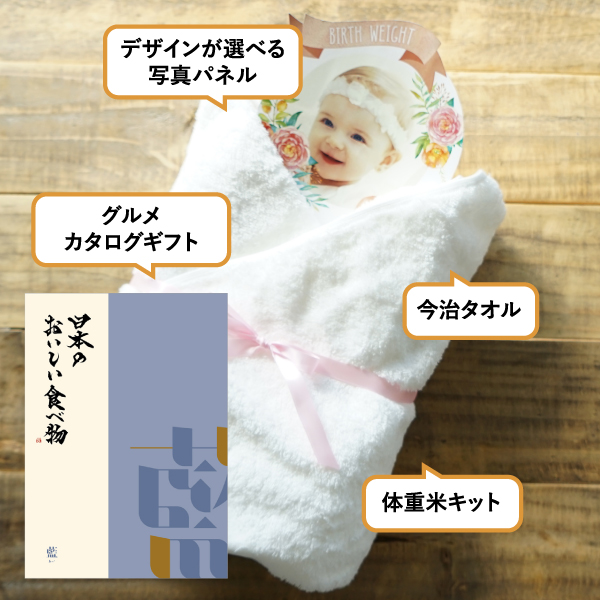 | 内容物 | カタログギフト 日本のおいしい食べ物【6000円コース】藍×1、PREMIUM バスタオル1枚(ホワイト)×1、リボン、米袋、お写真入りパネル |
