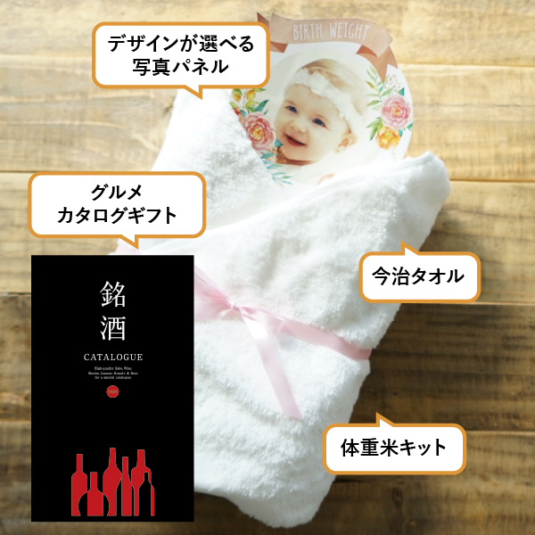 | 内容物 | カタログギフト 銘酒【11000円コース】GS03×1、PREMIUM バスタオル1枚(ホワイト)×1、リボン、米袋、お写真入りパネル |