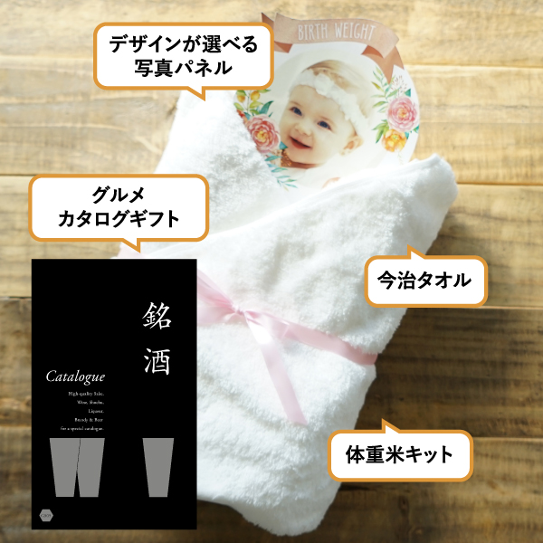 | 内容物 | カタログギフト 銘酒【21400円コース】GS05×1、PREMIUM バスタオル1枚(ホワイト)×1、リボン、米袋、お写真入りパネル |