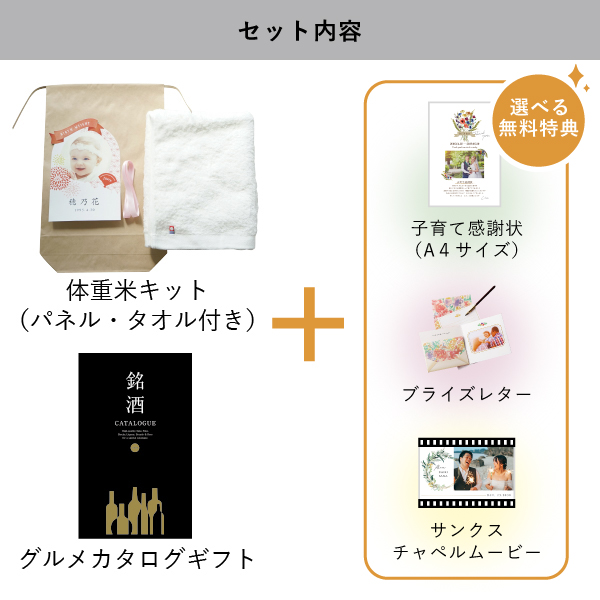 | 無料特典 | ブライズレター1セット(レターケース、専用レター5枚)、子育て感謝状(A4サイズ)(※フレームは付きません。)、サンクスチャペルムービーの中から1つお選びいただけます。 |