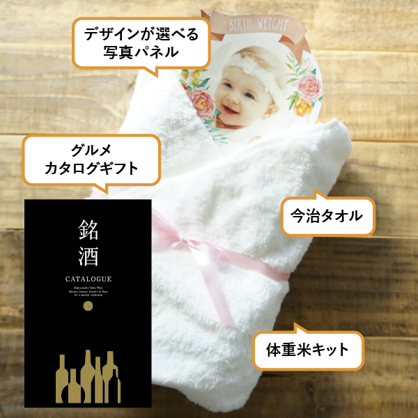| 内容物 | カタログギフト 銘酒【31400円コース】GS06×1、PREMIUM バスタオル1枚(ホワイト)×1、リボン、米袋、お写真入りパネル |