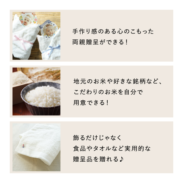 お母さんには生まれた時の体重を再現した体重米とお写真入りパネル、お父さんにはこだわりの逸品をお届けするカタログギフト… 結婚披露宴のワンシーンに、PIARYの体重米手作りキットでご両親へ最高の感謝を伝えませんか?