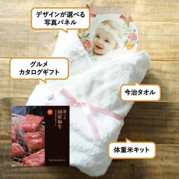| 内容物 | 選べる国産和牛カタログギフト【5000円コース】健勝(けんしょう)×1、PREMIUM バスタオル1枚(ホワイト)×1、リボン、米袋、お写真入りパネル |