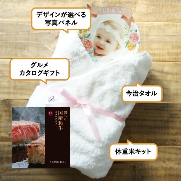 | 内容物 | 選べる国産和牛カタログギフト【20000円コース】延壽(えんじゅ)×1、PREMIUM バスタオル1枚(ホワイト)×1、リボン、米袋、お写真入りパネル |