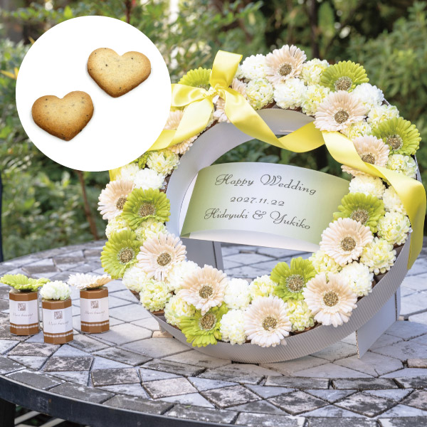 二人の特別な1日のために集まってくれたゲストの方々に、華やかなお花とクッキーで、ハッピーのおすそ分け。