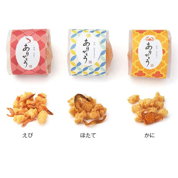 | 原材料 | 【えび】おかき〔餅米(国産)、うるち米(国産)、米油、魚介エキスパウダー、食塩、デキストリン、ぶどう糖、粉末しょうゆ、たん白加水分解物、香辛料〕、乾燥照り焼き海老〔えび、砂糖、しょうゆ、みりん〕/調味料(アミノ酸等)、香料、微粒二酸化ケイ素、(一部にえび・小麦・大豆・鶏肉・豚肉を含む) 【かに】おかき〔餅米(国産)、うるち米(国産)、米油、デキストリン、魚介エキスパウダー、食塩、粉末しょうゆ、たん白加水分解物、カニガラパウダー/調味料(アミノ酸等)、リン酸Ca、香料、着色料(カラメル)〕乾燥かに〔アカイシカニ、砂糖、でん粉、しょうゆ、みりん/調味料(アミノ酸等)、着色料(赤3、黄4、黄5)〕、(一部にえび・かに・小麦・大豆・鶏肉・豚肉を含む) 【ほたて】おかき〔餅米(国産)、うるち米(国産)、米油、粉末しょうゆ、グラニュー糖、たん白加水分解物、デキストリン、食塩、魚介エキスパウダー〕、焼きひも乾燥〔貝ひも、砂糖、食塩、唐辛子〕/ソルビトール、調味料(アミノ酸等)、リン酸Ca、香料、着色料(カラメル)、酸味料、(一部にかに・小麦・いか・さば・ゼラチン・大豆・鶏肉・豚肉を含む) |