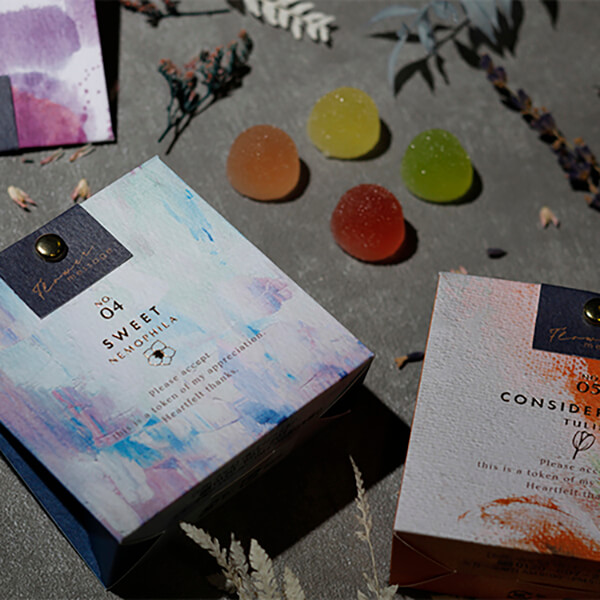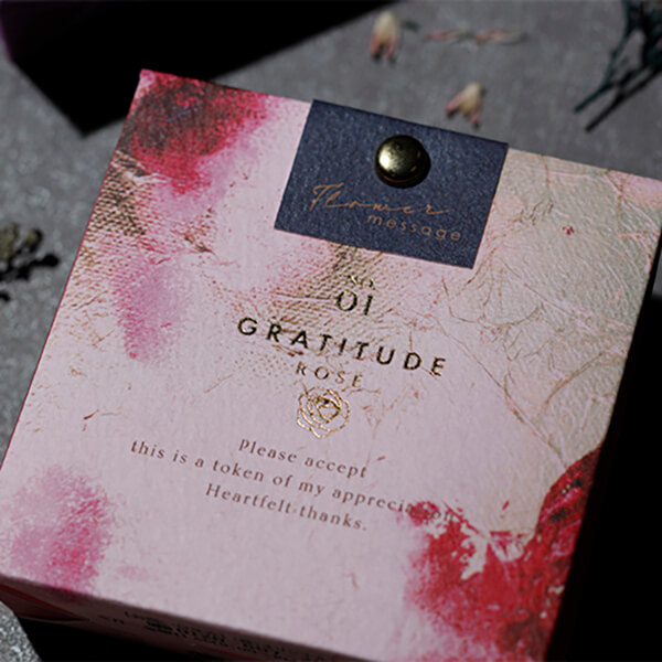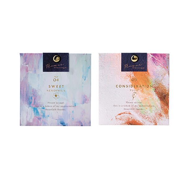 まるで手のひらサイズのキャンバス 5種類の色鮮やかでアーティスティックなペイントは、バラやチューリップなどお花をイメージしたデザイン。文字のきらりとした光沢が、高級感を演出します。