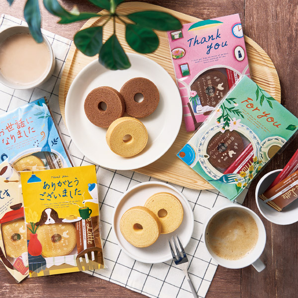 深川カントリーファームの有精卵を使ったバームクーヘンとドトールコーヒーのインスタントスティックを添えた、メッセージ&カフェタイムのプチギフトです。