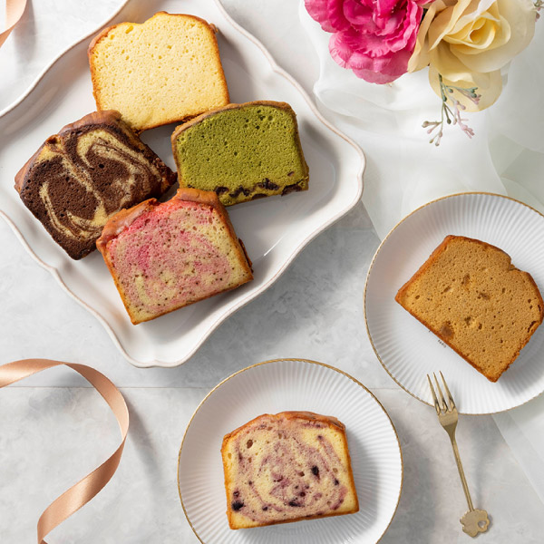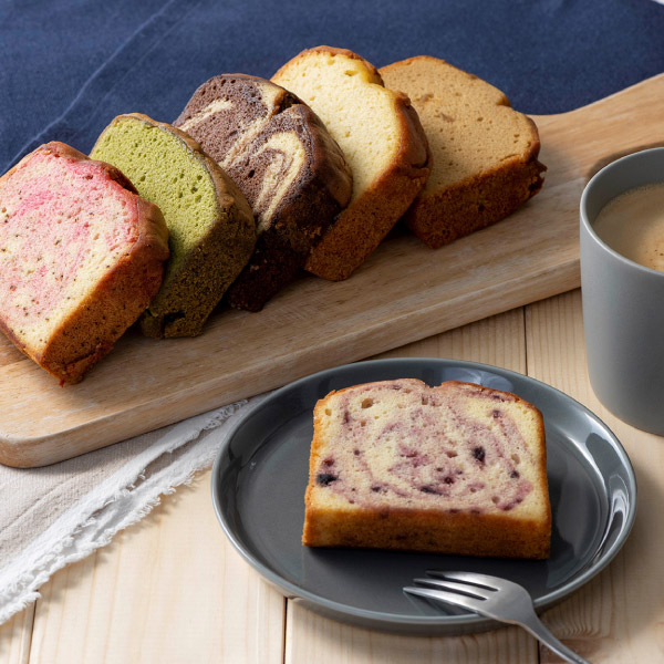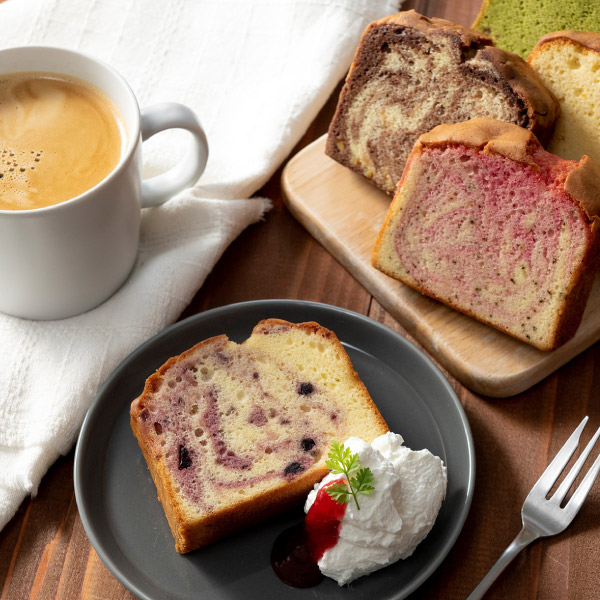 フルーツを混ぜ込んだ大きなしっとりパウンドケーキです。ずっしりとしたサイズ感ですが、ふんわり軽い食感で意外にぺろりと食べられます。朝食代わりやデザートにも。フルーツとフレーバーが組み合わさったそれぞれの味わいをお楽しみください。