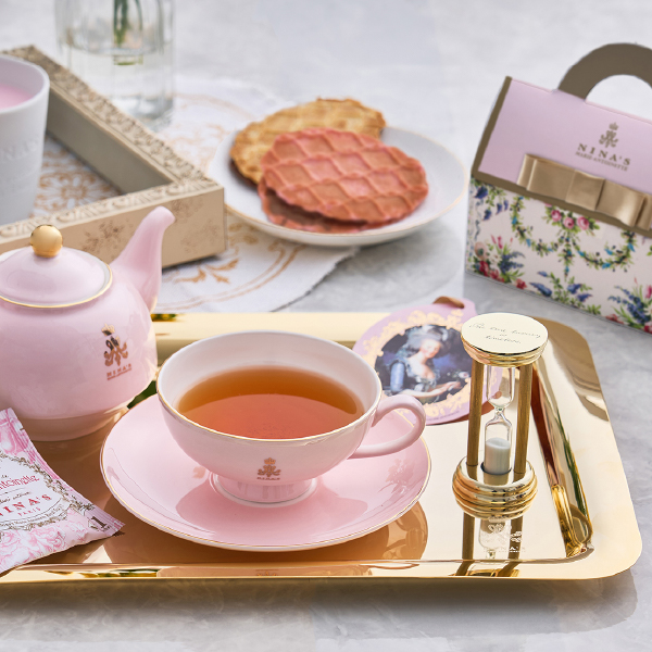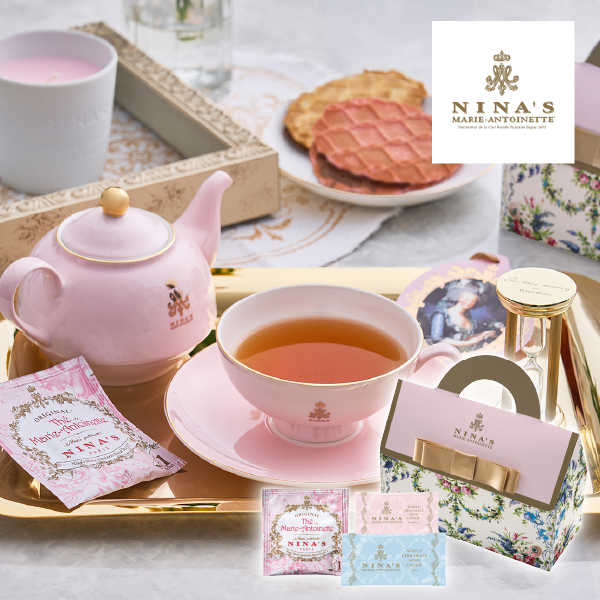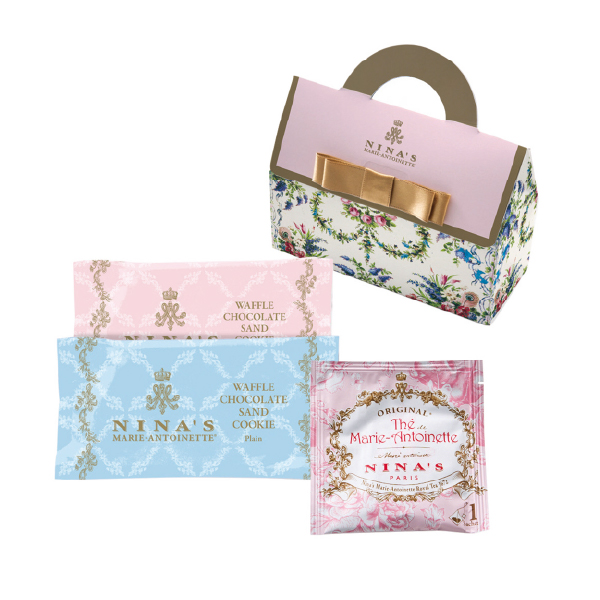 王妃マリー・アントワネットのラグジュアリー・ティーをイメージした、老舗フランス紅茶ブランド「ニナス」の紅茶と、チョコレートをサンドした香ばしいワッフルクッキーをセットでお届けします。