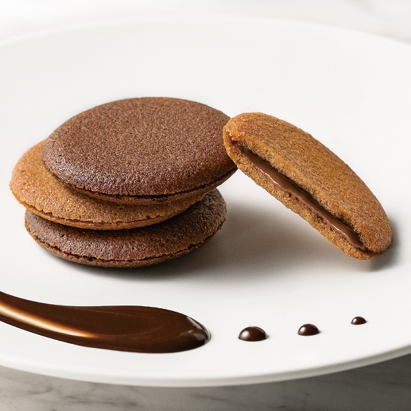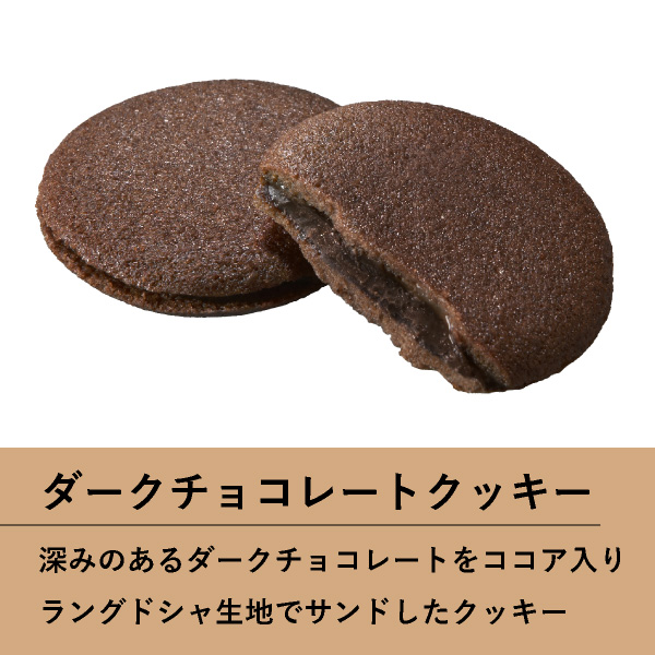 ビタースイートなダークチョコレートの味わいを、カカオの香る軽やかなラングドシャとともに。チョコレートを練りこんで焼き上げたラングドシャでダークチョコレートをサンドしたクッキー。4枚入ったミニボックスは、ちょっとしたギフトにぴったりです。パッケージデザインにはリボンを施しました。