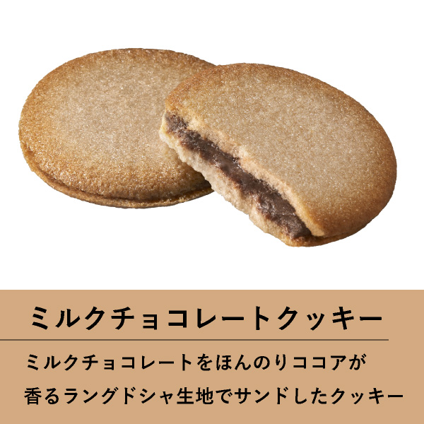 ミルクチョコレートのまろやかで風味豊かな味わいを、軽やかな食感でやさしい甘みのラングドシャとともに。チョコレートを練りこんで焼き上げたラングドシャでミルクチョコレートをサンドしたクッキー。4枚入ったミニボックスは、ちょっとしたギフトにぴったりです。パッケージデザインにはリボンを施しました。