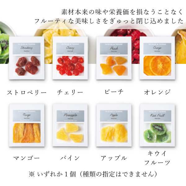 | 内容物 | ストロベリー20g×1、チェリー20g×1、ピーチ20g×1、オレンジ20g×1、マンゴー20g×1、パイン20g×1、アップル20g×1、キウイフルーツ20g×1 のいずれか1個(種類の指定はできません) |