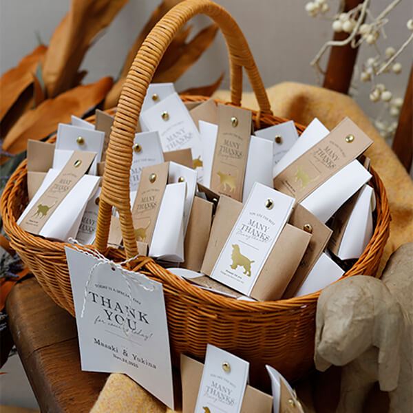 甘えん坊の"Dog"とツンデレな"Cat"がありがとうの気持ちを込めてゲストを迎えてくれる。 可愛く駆け寄るDogとおすましCatがウェルカムギフトに!ナチュラルな雰囲気ときらりと光るイラストが特別感とラフ感、どちらも演出してくれます。