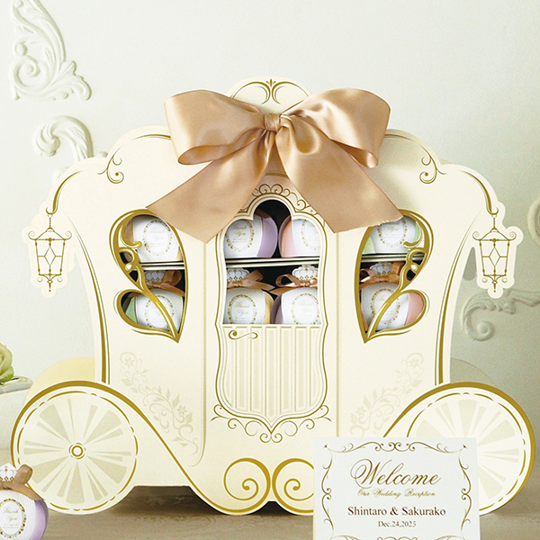 馬車でとっても可愛いです。 クッキーも美味しく、ドレスとタキシードになっていて可愛いです。