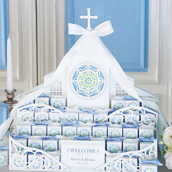 聖なる誓いを立てたふたりを見守る大聖堂をモチーフに 大聖堂を思わせる厳かなたたずまいのホワイトチャペル。人前式や、教会式ウェディングのパーティーにぴったりです。パーティー後も思い出とともにご自宅に飾ることができます。