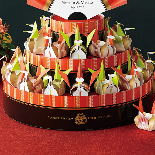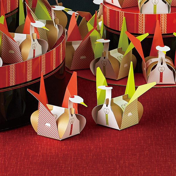 夫婦円満と延命長寿 ゲストに贈る吉祥モチーフ 鶴は夫婦の絆がとても強く、つがいになると生涯同じ相手と添い遂げるといわれており、さらに、長寿の象徴ともされていることから婚礼シーンにぴったりのモチーフとして好まれています。