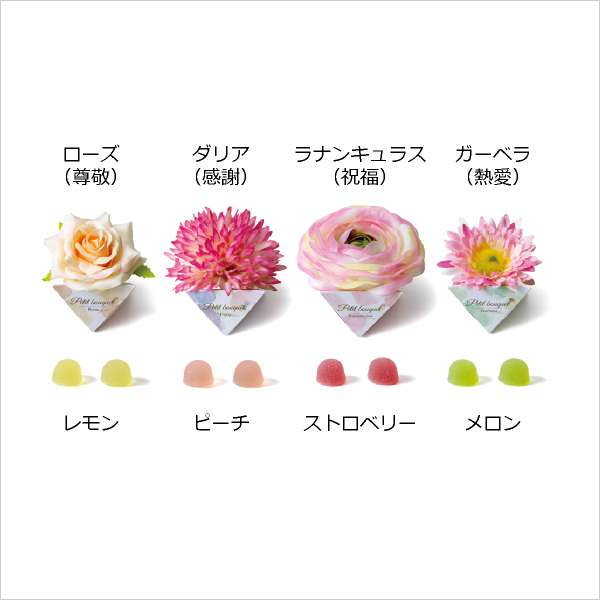| 内容物 | フルーツゼリー2個入(レモン・ピーチ・ストロベリー・メロン)、フラワーマグネット1個(ローズ・ダリア・ラナンキュラス・ガーベラ)×40個 |
