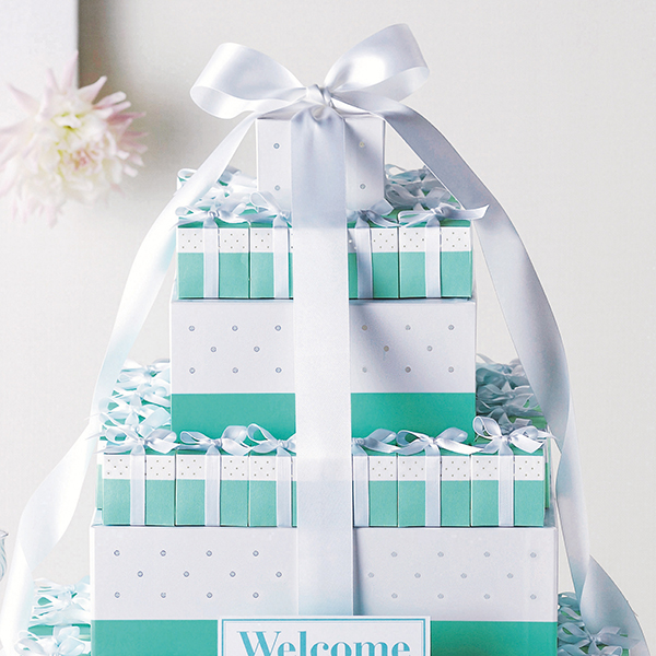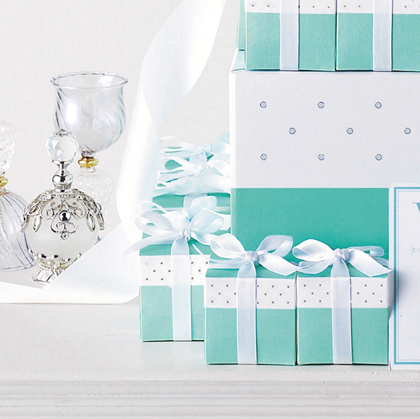 花嫁のためのピュアなブルー 純白とブルーを使ってデザインされた爽やかなプチギフトは、シンプル&キュートなスタイルのウェディングにおすすめ。