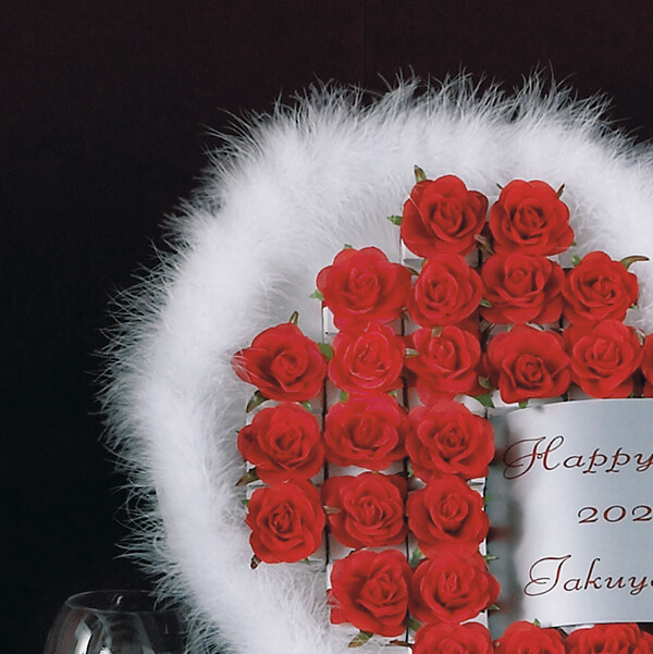 思い切りロマンティックな披露宴にするなら大人かわいくファー付ウェルカムギフトがぴったり。真っ赤なバラのモチーフがハート型に!ふわふわのファーがより一層華やかに、大人かわいい雰囲気を演出してくれます。