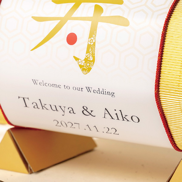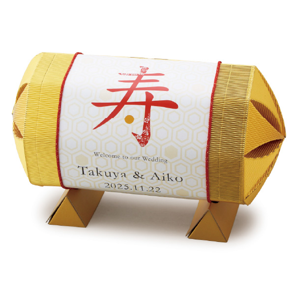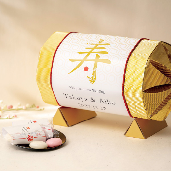豊かな実りを象徴する俵の中に、紅白のお餅を詰め込んだ「寿俵 ありがとうのきもち」。五穀豊穣を表す縁起の良いパッケージが、ゲストへの感謝の気持ちを温かく伝えます。おふたりの記念日とお名前入りプレート付きで、ウェルカムスペースの飾りにもぴったり。和装での結婚式におすすめの華やかなプチギフトです。