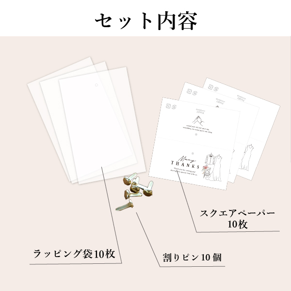 | 内容物 | ・スクエアペーパー(ペーパーヘッダー)×10枚 ・割りピン×10個 ・ラッピング袋(PP袋)×10枚 |