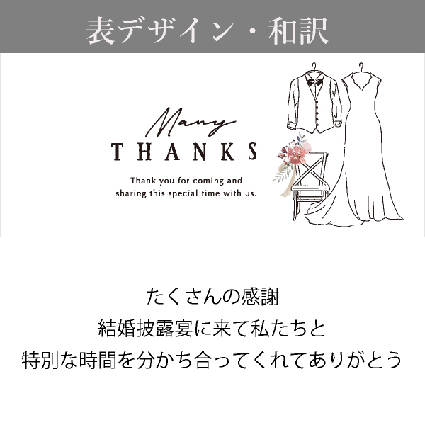 タキシードやウェディングドレスが壁に掛けられ、椅子にはブーケがおかれている様子が描かれているデザイン。