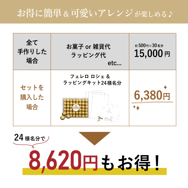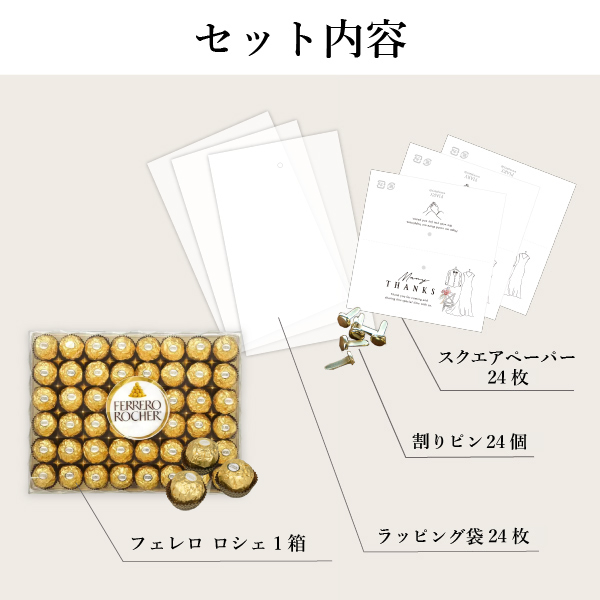 | 内容物 | ・スクエアペーパー(ペーパーヘッダー)×24枚 ・割りピン×24個 ・ラッピング袋(PP袋)×24枚 ・フェレロロシェ ×各24名様分(1名様あたり2個ずつ使用) |
