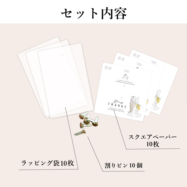 | 内容物 | ・スクエアペーパー(ペーパーヘッダー)×10枚 ・割りピン×10個 ・ラッピング袋(PP袋)×10枚 |