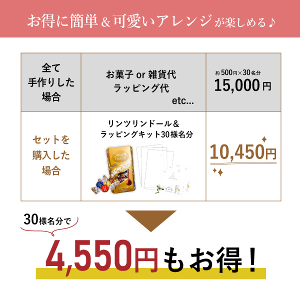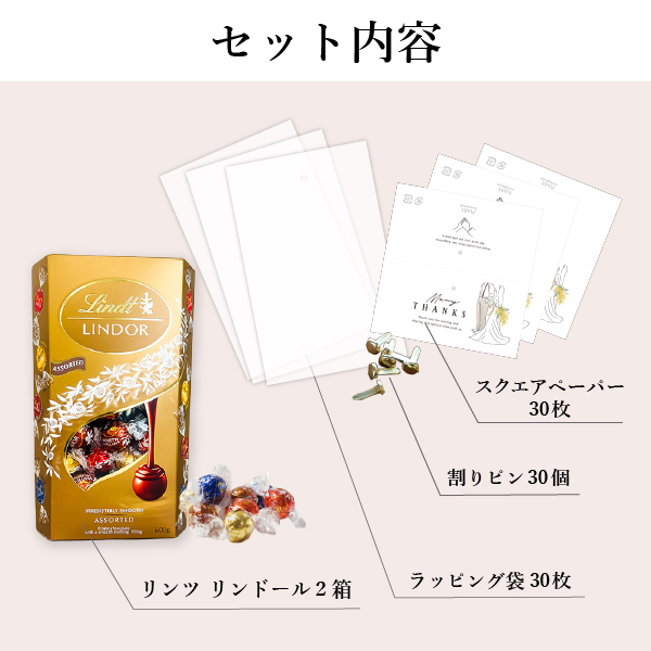 | 内容物 | ・スクエアペーパー(ペーパーヘッダー)×30枚 ・割りピン×30個 ・ラッピング袋(PP袋)×30枚 ・リンツ リンドール ゴールド アソート ×各30名様分(1名様あたり3個ずつ使用) |
