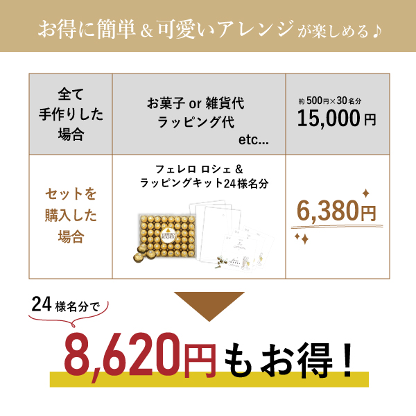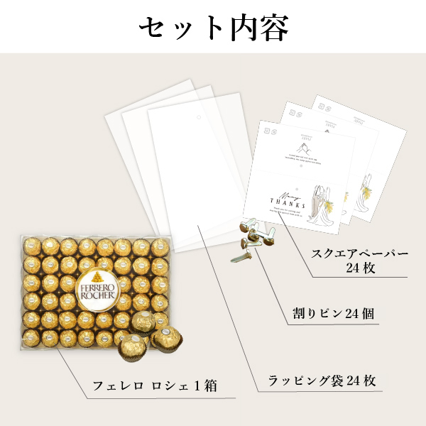 | 内容物 | ・スクエアペーパー(ペーパーヘッダー)×24枚 ・割りピン×24個 ・ラッピング袋(PP袋)×24枚 ・フェレロロシェ ×各24名様分(1名様あたり2個ずつ使用) |