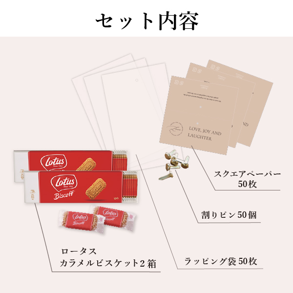 お菓子の国ベルギー生まれのビスケット、ロータスと、ペーパーヘッダー・ラッピング袋・割りピンがセットになっています。
