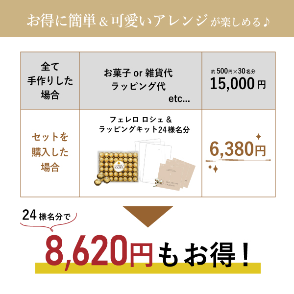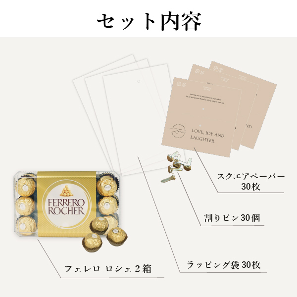 | 内容物 | ・スクエアペーパー(ペーパーヘッダー)×24枚 ・割りピン×24個 ・ラッピング袋(PP袋)×24枚 ・フェレロロシェ ×各24名様分(1名様あたり2個ずつ使用) |