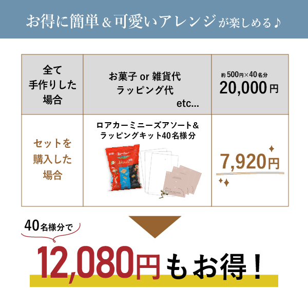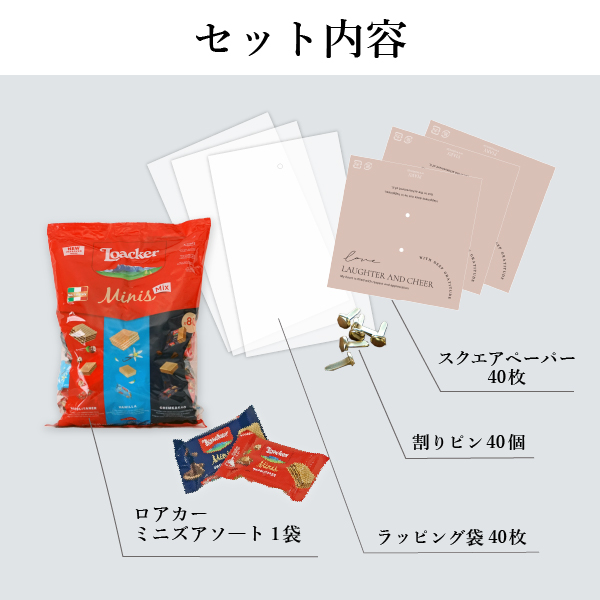 | 内容物 | ・スクエアペーパー(ペーパーヘッダー)×40枚 ・割りピン×40個 ・ラッピング袋(PP袋)×40枚 ・ロアカー ミニーズ ウエハースミニーズ ミックス ×各40名様分(1名様あたり2個ずつ使用) |