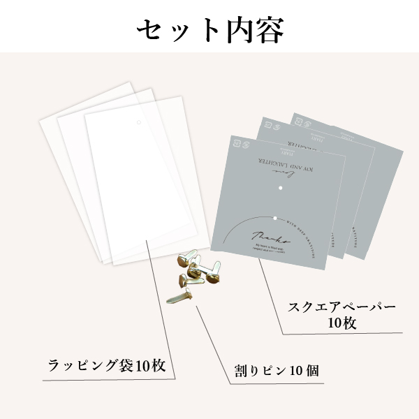 | 内容物 | ・スクエアペーパー(ペーパーヘッダー)×10枚 ・割りピン×10個 ・ラッピング袋(PP袋)×10枚  |