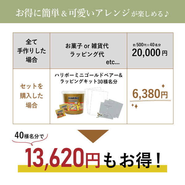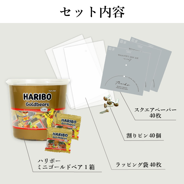 | 内容物 | ・スクエアペーパー(ペーパーヘッダー)×40枚 ・割りピン×40個 ・ラッピング袋(PP袋)×40枚 ・ハリボー ミニゴールドベア ×40名様分(1名様あたり2個ずつ使用) |
