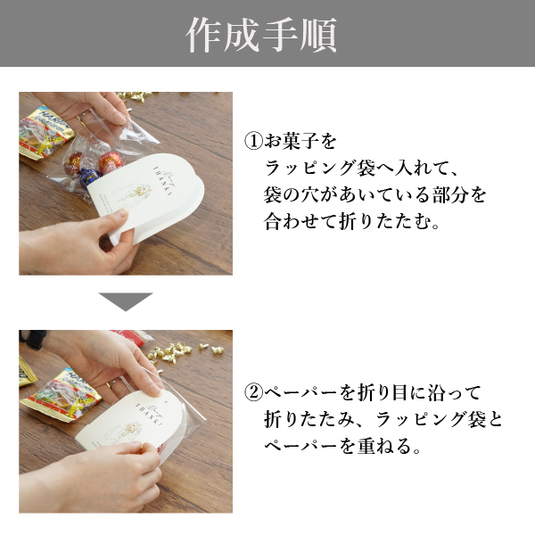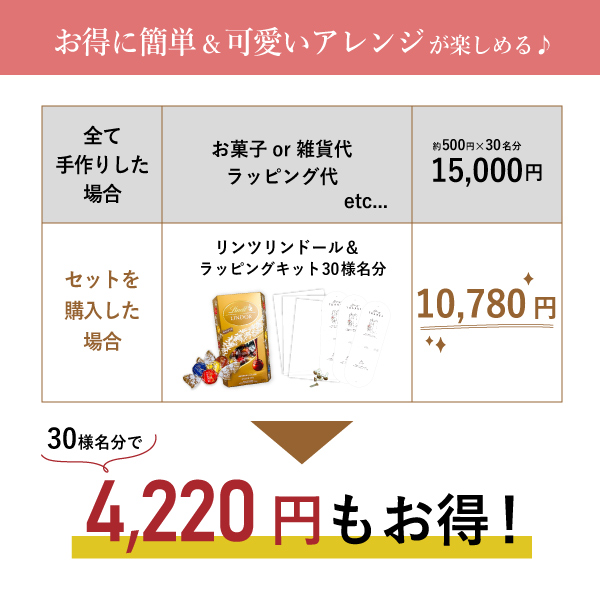 | 内容物 | ・アーチペーパー(ペーパーヘッダー)×30枚 ・割りピン×30個 ・ラッピング袋(PP袋)×30枚 ・リンツ リンドール ゴールド アソート ×各30名分(1名様あたり3個ずつ使用) |