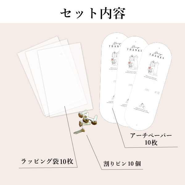 | 内容物 | ・アーチペーパー(ペーパーヘッダー)×10枚 ・割りピン×10個 ・ラッピング袋(PP袋)×10枚 |