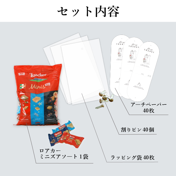 | 内容物 | ・アーチペーパー(ペーパーヘッダー)×40枚 ・割りピン×40個 ・ラッピング袋(PP袋)×40枚 ・ロアカー ミニーズ ウエハースミニーズ ミックス ×各40名様分(1名様あたり2個ずつ使用) |