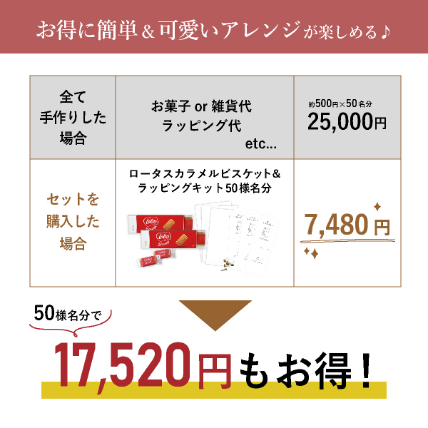 | 内容物 | ・アーチペーパー(ペーパーヘッダー)×50枚 ・割りピン×50個 ・ラッピング袋(PP袋)×50枚 ・ロータスビスコフ オリジナルカラメルビスケット ×各50名様分(1名様あたり2個ずつ使用) |