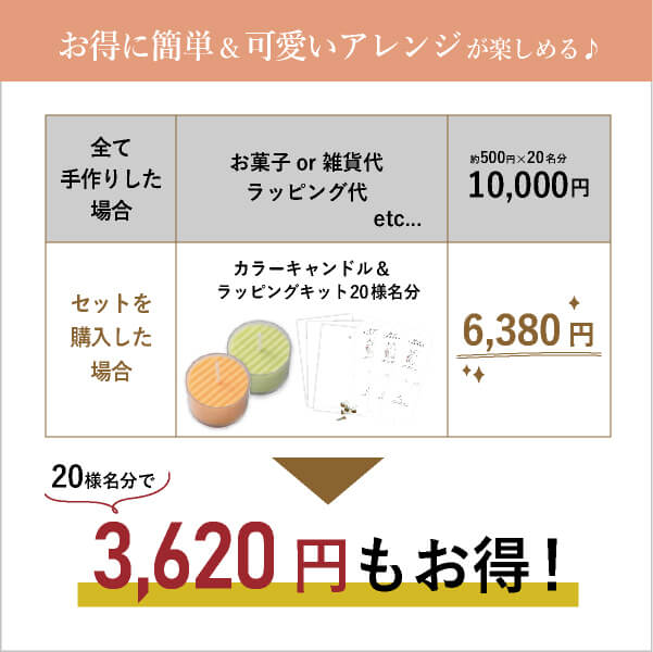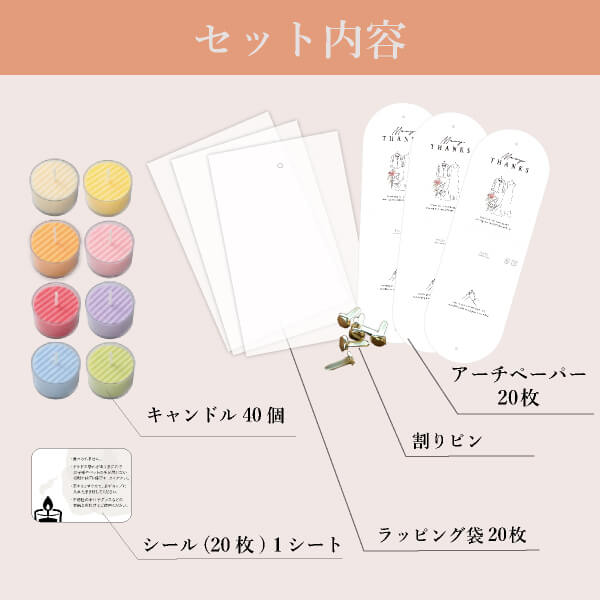 | 内容物 | ・アーチペーパー(ペーパーヘッダー)×20枚 ・割りピン×20個 ・ラッピング袋(PP袋)×20枚 ・キャンドル ×各20名様分(1名様あたり2個ずつ使用) ・注意喚起のシール×1シート(1名様あたり1個使用) |
