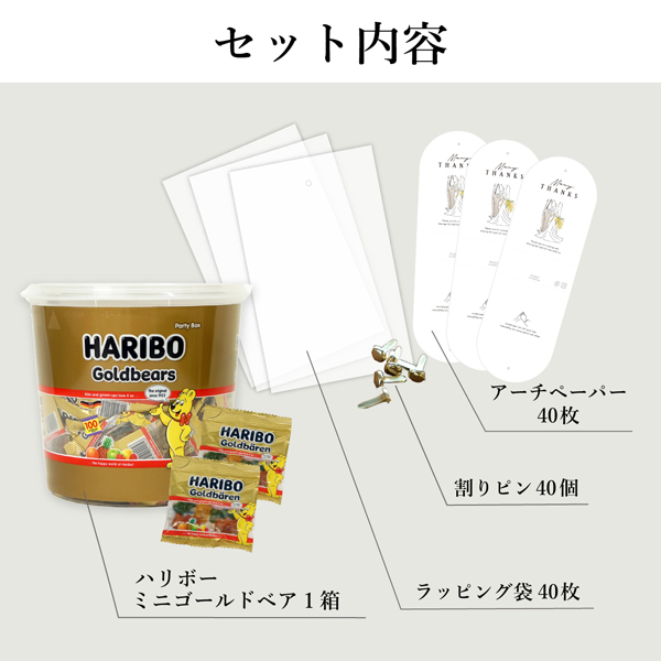 | 内容物 | ・アーチペーパー(ペーパーヘッダー)×40枚 ・割りピン×40個 ・ラッピング袋(PP袋)×40枚 ・ハリボー ミニゴールドベア ×各40名様分(1名様あたり2個ずつ使用)  |
