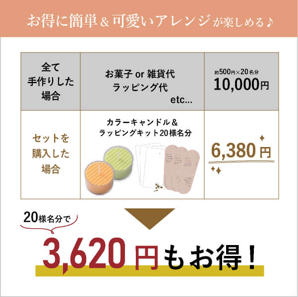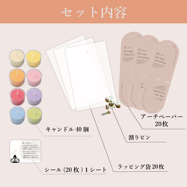 | 内容物 | ・アーチペーパー(ペーパーヘッダー)×20枚 ・割りピン×20個 ・ラッピング袋(PP袋)×20枚 ・キャンドル ×各20名様分(1名様あたり2個ずつ使用) ・注意喚起のシール×1シート(1名様あたり1個使用) |
