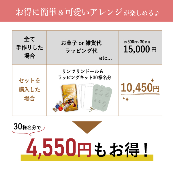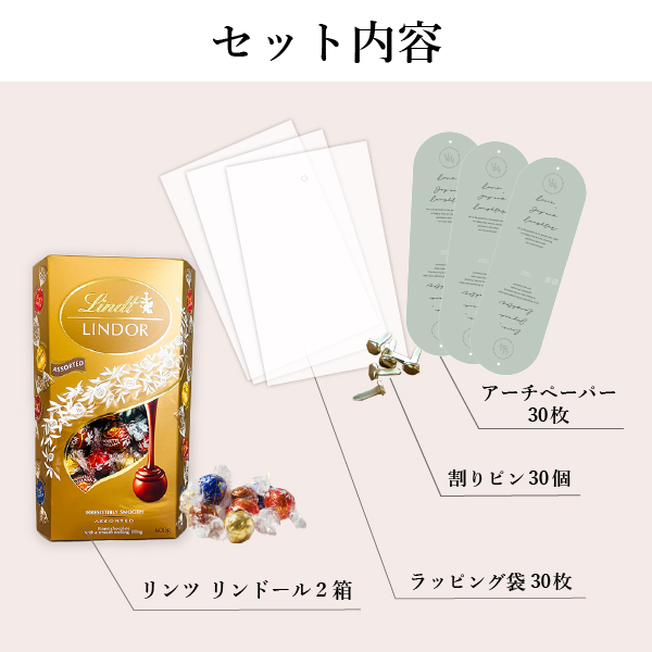 | 内容物 | ・アーチペーパー(ペーパーヘッダー)×30枚 ・割りピン×30個 ・ラッピング袋(PP袋)×30枚 ・リンツ リンドール ゴールド アソート ×各30名分(1名様あたり3個ずつ使用) |