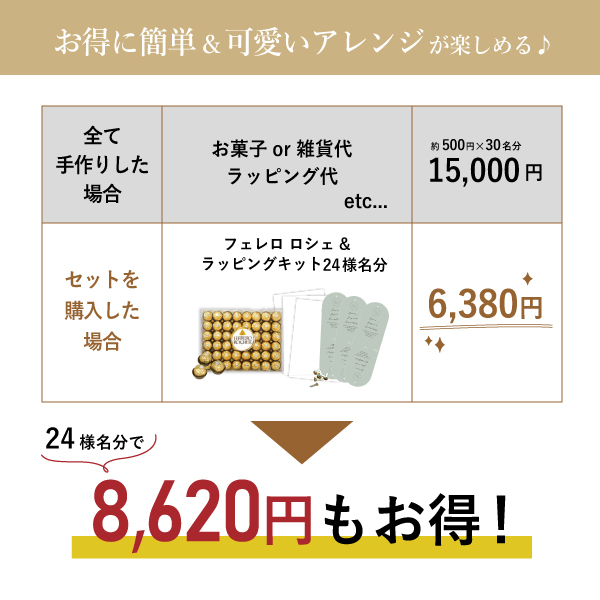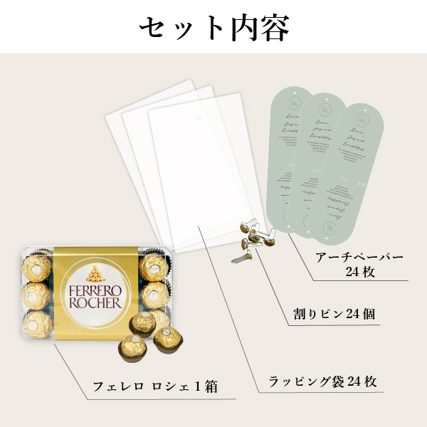 | 内容物 | ・アーチペーパー(ペーパーヘッダー)×24枚 ・割りピン×24個 ・ラッピング袋(PP袋)×24枚 ・フェレロロシェ ×各24名様分(1名様あたり2個ずつ使用) |