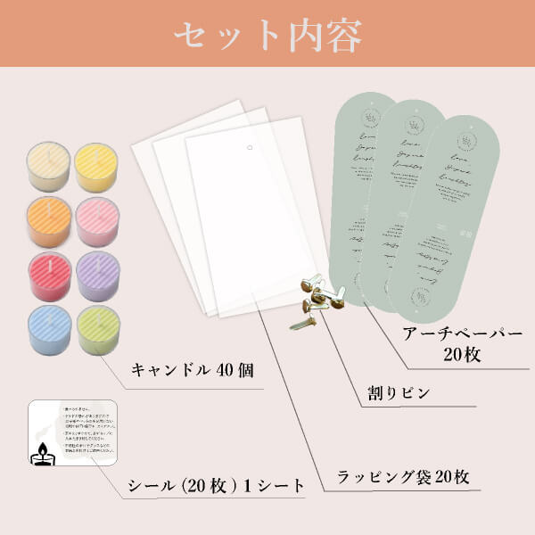 | 内容物 | ・アーチペーパー(ペーパーヘッダー)×20枚 ・割りピン×20個 ・ラッピング袋(PP袋)×20枚 ・キャンドル ×各20名様分(1名様あたり2個ずつ使用) ・注意喚起のシール×1シート(1名様あたり1個使用) |