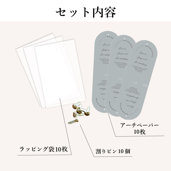 | 内容物 | ・アーチペーパー(ペーパーヘッダー)×10枚 ・割りピン×10個 ・ラッピング袋(PP袋)×10枚 |